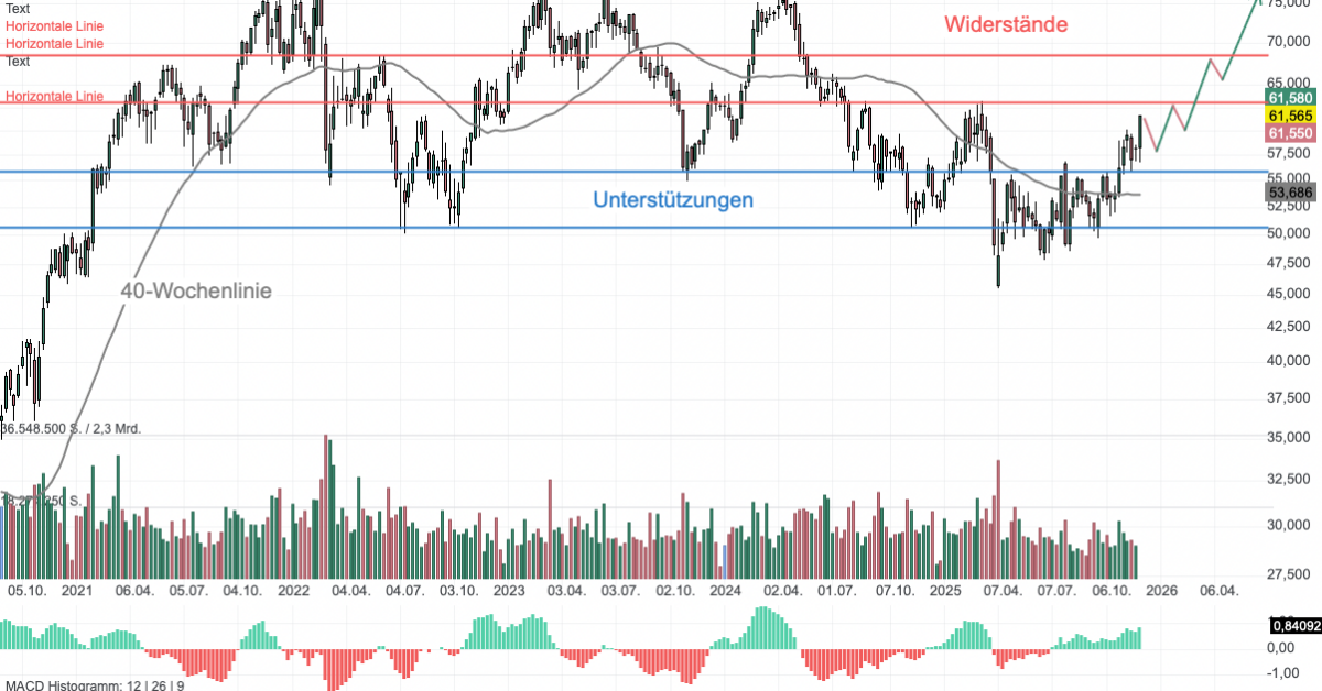 Die Aktie der Mercedes-Benz Group (MBG) bewegte sich von Anfang 2022 hauptsächlich in einer Seitwärtsspanne, nachdem sie 2021 eine starke Aufwärtsbewegung hingelegt hatte. Im Jahr 2025 ging es unter diese Range kurzzeitig nach unten durchbrochen, wobei sich der Kurs jedoch schnell wieder erholt hat. Die Notierungen liegen aktuell wieder deutlich über der 40-Wochenlinie. Unterstützungszonen befinden sich im Bereich von 56 Euro und 50 Euro. Ein Unterschreiten dieser Marken wäre ein stark negatives Signal. Die Aktie steht vor einer starken Widerstandszone im Bereich von 63 Euro. Ein nachhaltiger Ausbruch über diesen Bereich wäre ein sehr starkes Kaufsignal und würde den Weg zu höheren Kursen in Richtung 76 Euro ebnen. Die Slow Stochastik befindet sich aktuell im überkauften Bereich, was bedeutet, dass die Aufwärtsbewegung sehr stark ist und kurzfristig ein Rücksetzer möglich wäre.