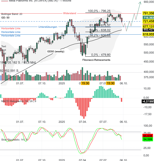 Aus charttechnischer Sicht zeigt Meta auf Wochenbasis eine dynamische Aufwärtsbewegung, die zuletzt in eine Konsolidierung überging. Im kurz- bis mittelfristigen Kontext könnte sich der Abwärtsdruck bei der Aktie nochmal aufgrund der Gefahr eines potenziellen Doppelhochs im Bereich von 795 USD beschleunigen. Fällt die Aktie nachhaltig unter 721 USD, befinden sich die nächsten Unterstützungen bei 677 USD, gefolgt von 640 bis 652 USD und 618 USD. Zwischen 618 und 652 USD baue ich meine laufenden Investmentpositionen weiter aus. Ab hier erwarte ich eine Fortführung der übergeordneten Aufwärtsbewegung mit den Kurszielen bis zu 900 USD. Das Volumen zeigt während der Konsolidierung keine auffällige Schwäche, was auf eine gesunde Korrektur hindeutet. Die Slow Stochastik bewegt sich aktuell aus dem überkauften Bereich nach unten, was kurzfristig für Zurückhaltung spricht, mittelfristig aber eine neue Einstiegschance eröffnen könnte. Selbiges gilt für das MACD-Histogramm.