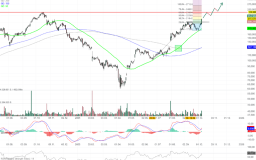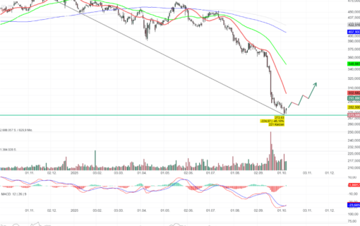 Ende 2021 erreichte die Aktie von Microsoft (MSFT) das Jahreshoch bei 349,67 USD. Anschließend rutschte das Papier unter die 40-Wochenlinie und gab bis 213 USD nach. Mit einer markanten grünen Kerze schafften es die Bullen im März 2023 wieder über den GD 40 und nahmen Kurs auf das Hoch von 2021. Nach einer kurzen Konsolidierungsphase gelang Ende Oktober der entscheidende Ausbruch über die 349-USD-Marke, gefolgt von einer Rallye bis zum Rekordhoch von 468,35 USD. Ein Rücksetzer bis auf 385 USD führte zu einer Seitwärtsbewegung, bevor die Kurse bis 344 USD weiter nachgaben. Hier hat die Aktie nach oben gedreht und seitens der Slow Stochastic gab es ein Kaufsignal. Gelingt der Ausbruch über die psychologisch wichtige Marke von 400 USD und anschließend über die Abwärtstrendlinie, befindet sich das nächste Kursziel bei 450 USD. Danach rückt das Rekordhoch wieder in greifbare Nähe.