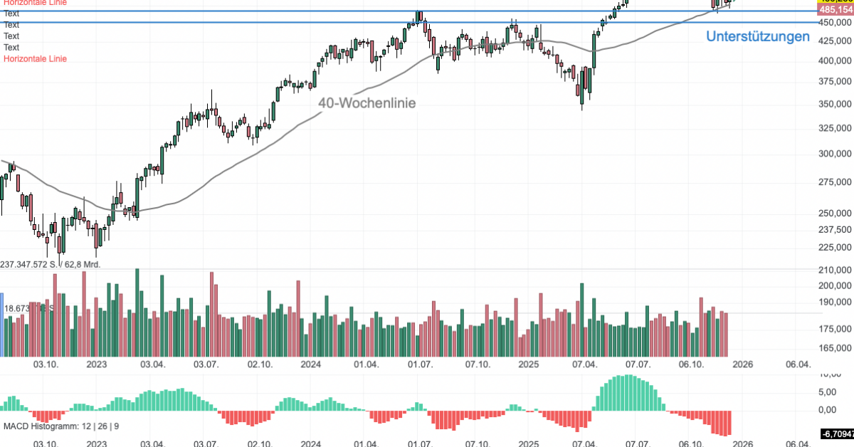 Die Aktie von Microsoft (MSFT) notiert aktuell bei rund 485 USD. Sie kämpft derzeit um den Verbleib oberhalb der 40-Wochenlinie, die als wichtiger Trendindikator für das mittel- bis langfristige Sentiment gilt. Ein nachhaltiges Unterschreiten könnte auf eine längere Korrekturphase hindeuten, während ein Abprallen nach oben den Aufwärtstrend bestätigen würde. Nach dem Erreichen des Rekordhochs bei 555,45 USD hat die Aktie ein Doppeltop ausgebildet. Die nächsten wichtigen Auffangbereiche liegen bei 468 bis 448 USD. Auf dem Weg nach oben bilden die Marken von 493, 530 USD und das bisherige Rekordhoch die entscheidenden Hürden. Ein Ausbruch darüber könnte das im Chart visualisierte Szenario in Richtung 600 USD aktivieren. Der Slow Stochastik-Indikator befindet sich im stark überverkauften Bereich. Dies würde eine baldige technische Gegenreaktion oder eine Bodenbildung unterstützen.