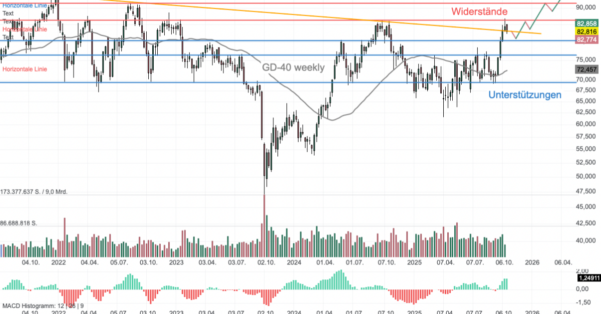 Die Aktie von NextEra Energy (NEE) bewegte sich von Ende 2021 bis zum tiefsten Punkt im Oktober 2023 in einem ausgeprägten Abwärtstrend. Die orange Trendlinie definiert diese Richtung. Das Versorgerpapier hat in der Vergangenheit mehrmals an dieser Linie Widerstand gefunden. 2024 bildete sich ein höheres Tief und die Aktie konnte gerade die Abwärtstrendlinie überwinden. Bei 86 USD befindet sich eine horizontale Widerstandszone. Darunter dient die Zone um 76 bis 80 USD als wichtige Unterstützung. Der GD 40 Weekly dient als dynamische Unterstützung. Die Slow-Stochastik befindet sich mit einem Wert von über 84 im überkauften Bereich, was kurzfristig auf die Möglichkeit eines Rücksetzers hindeuten würde. Zielbereiche zur Oberseite wären nach 91 und 93 USD die psychologisch wichtige 100-USD-Marke.