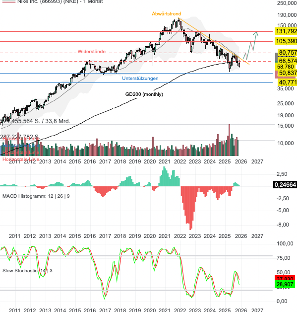 Aus charttechnischer Sicht befindet sich Nike in einem mehrjährigen Abwärtstrend. Aktuell versucht sich die Aktie im Bereich des GD200 (monthly) zu stabilisieren, scheiterte nach der Bekanntgabe der Quartalszahlen jedoch am Widerstand von 66 USD. Grundsätzlich gilt: solange der Abwärtstrend nicht nachhaltig nach oben durchbrochen werden kann, ist mit weiter fallenden Kursen zu rechnen. Die nächste Auffangzone befindet sich bei 50 USD, gefolgt von 40 USD. Gelingt hingegen der Anstieg über 66 USD, hellt sich das Bild erstmals auf. Bei einem Anstieg über 80 USD, entsteht ein Turnaround-Signal. Hier befindet sich das letzte lokale Zwischenhoch des Abwärtstrends. In einem solchen Fall befinden sich die darauffolgenden Kursziele bei 105 USD, gefolgt von 131 USD. Ich halte an meinen bestehenden Positionen fest und stocke diese entweder über 66 USD auf oder bei 50 USD.