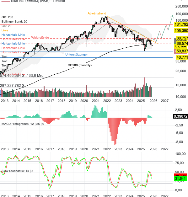 Aus charttechnischer Sicht zeigt Nike weiterhin ein angeschlagenes Bild, denn die Aktie befindet sich unverändert in einem mehrjährigen Abwärtstrend. Zwar versucht der Kurs aktuell, sich im Bereich des GD200 (monthly) zu stabilisieren, doch nach den jüngsten Quartalszahlen prallte die Aktie erneut am markanten Widerstand bei 67 USD ab. Solange dieser übergeordnete Abwärtstrend nicht klar und nachhaltig überwunden wird, bleibt das Risiko weiterer übergeordneter Kursrückgänge bestehen. Die nächsten relevanten Unterstützungszonen liegen bei 50 USD und darunter bei 40 USD. Erst dort könnte sich eine stärkere Gegenbewegung entwickeln. Auf der Oberseite gilt: Ein Ausbruch über 67 USD würde das Chartbild erstmals spürbar aufhellen und die Chance auf eine Trendwende erhöhen. Ein wirkliches Turnaround‑Signal entsteht jedoch erst bei einem Anstieg über 80 USD – dem letzten markanten Zwischenhoch innerhalb des Abwärtstrends. In diesem Szenario rücken Kursziele bei 105 USD und anschließend 131 USD, gefolgt von 190 USD in den Fokus. Ich bleibe meinen bestehenden Positionen treu und stocke sukzessive weiter auf.