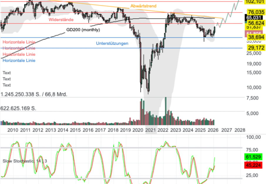 Aus charttechnischer Sicht befindet sich Occidental Petroleum trotz des massiven Anstiegs ausgehend vom Jahr 2021 innerhalb eines jahrzehntelangen Abwärtstrends. Allerdings nähert sich die Aktie inzwischen dieser Trendlinie an. Ein Breakout könnte folgen. Erfolgt ein derartiger Anstieg über das letzte lokale Zwischenhoch bei ca. 76 USD, entsteht ein übergeordnetes (Aufwärts-)Trendfortsetzungssignal. Die nächsten Kursziele befinden sich im Anschluss bei 102 USD, gefolgt von 150 USD. Zuletzt konnte sich Occidental Petroleum bei der Unterstützung von 39 USD stabilisieren. Das nächste kurz- bis mittelfristige Ziel befindet sich bei 56 USD und bei 76 USD. Fällt die Aktie unter 39 USD, trübt sich das Bild ein. Dann notiert die nächste Auffangzone bei 29 USD. In der Slow Stochastik wurde ein Kaufsignal generiert. Dieses stützt das Aufwärtsszenario.