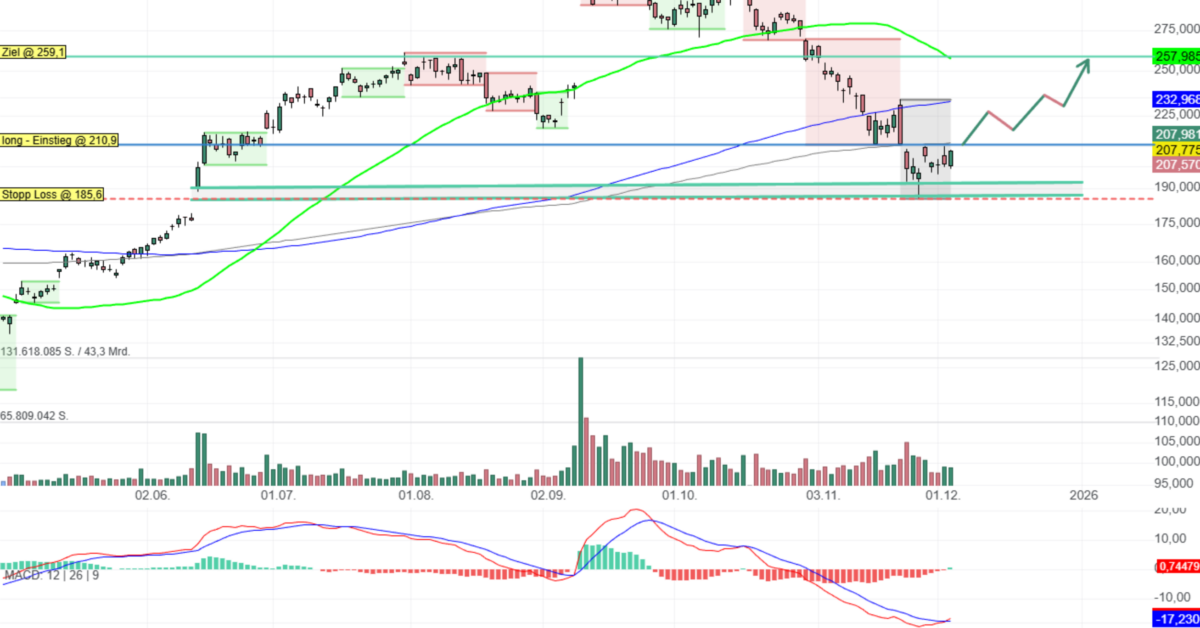 Bei Oracle (ORCL) kam es nach einem Up-Gap im September zu einem Rücksetzer, obwohl das Unternehmen starke Zahlen präsentierte und einen Multi-Milliarden-Deal mit OpenAI abschloss. Die verbleibenden Leistungsverpflichtungen (RPO) stiegen auf 455 Mrd. USD, ein Plus von 359 % gegenüber dem Vorjahr, vor allem aus KI-Projekten. Marktteilnehmer zeigen sich angesichts der aufgenommenen Schulden zur Kapazitätserweiterung besorgt. Die Deutsche Bank sieht den Rückgang als attraktiven Einstieg und bestätigt die Kaufempfehlung mit Kursziel 375 USD. Wells Fargo startet die Coverage am 3. Dezember mit Übergewichten und Kursziel 280 USD, sieht rund 40 % Aufwärtspotenzial und bezeichnet Oracle als potenziellen Leader im KI-Superzyklus. Das Unternehmen habe fast eine halbe Billion USD an KI-Aufträgen und sei bei Kunden wie OpenAI, xAI, Meta und TikTok in Pole-Position. Die Aktie liege rund 40 % unter dem Höchststand.