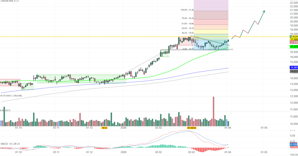 die Aktie des französischen Unternehmens Orange S.A. (WKN: 906849) lässt Raum für wilde Ziele. Die Orange-Aktie konsolidiert momentan auf einem hohen Niveau und bildet eine saubere bullische Konsolidierung aus. Der Kurs notiert dabei sehr stabil über dem GD50, was den mittelfristig intakten Aufwärtstrend klar unterstreicht. Der MACD hat auf Tagesbasis ein frisches Kaufsignal generiert. Gleichzeitig notiert der RSI bei rund 64 Punkten und bietet somit noch ausreichend Luft bis zur überkauften Zone. Überzeugende Quartalszahlen am 23.4. könnten den signifikanten Ausbruch aus dieser Konsolidierungsphase nochmals befeuern. Gelingt der nachhaltige Sprung über den Widerstand bei 18,55 Euro, rückt das Fibonacci-Level bei 19,66 Euro in den Fokus. Im optimalen Szenario erstreckt sich das Kursziel auf der Oberseite sogar bis hin zur Zielmarke von exakt 21,46 Euro. Ein Stop-Loss sollte zwingend bei ca. 16,75 Euro und damit knapp unter der unteren Begrenzung der Zone platziert werden. Das Chance-Risiko-Verhältnis liegt im Best Case bei exakt 2,5 : 1.