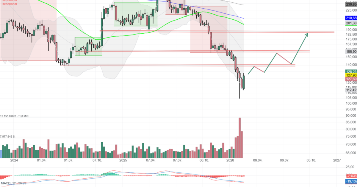 der Kurs von Paycom Software(WKN: A1XFVG) befindet sich nach einer heftigen Korrektur in einer Bodenbildungsphase und testet aktuell die Marke von 105 USD. Dort wurde unter erhöhtem Volumen absorbiert. Der Wochenchart zeigt eine erste Stabilisierung über dem markanten Tiefststand, wobei sich eine kurzfristige Erholung in Richtung der 140 USD-Marke abzeichnet. Der MACD-Indikator verbleibt im negativen Bereich, zeigt jedoch eine abflachende Dynamik, was auf nachlassenden Verkaufsdruck hindeutet. Die Slow Stochastic liefert aus dem überverkauften Bereich ein Kaufsignal (Wochenschluss wichtig!). Kursziele liegen auf der Oberseite bei 157 USD am Widerstand und mittelfristig bei 180 USD. Ein Stop-Loss wird bei 112 USD unter dem letzten Verlaufstief zur Absicherung platziert. Das CRV liegt im Best Case bei über 3 : 1.