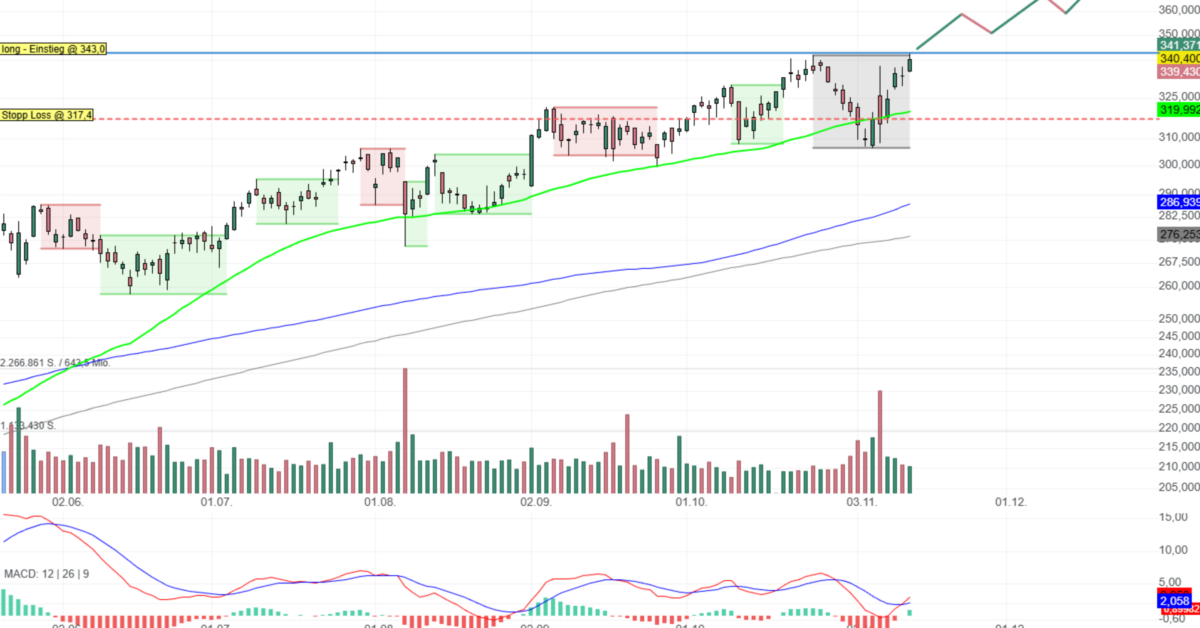 Bevorzugtes Szenario: Stop Buy über 343 USD. SL bei ca. 317 USD.
