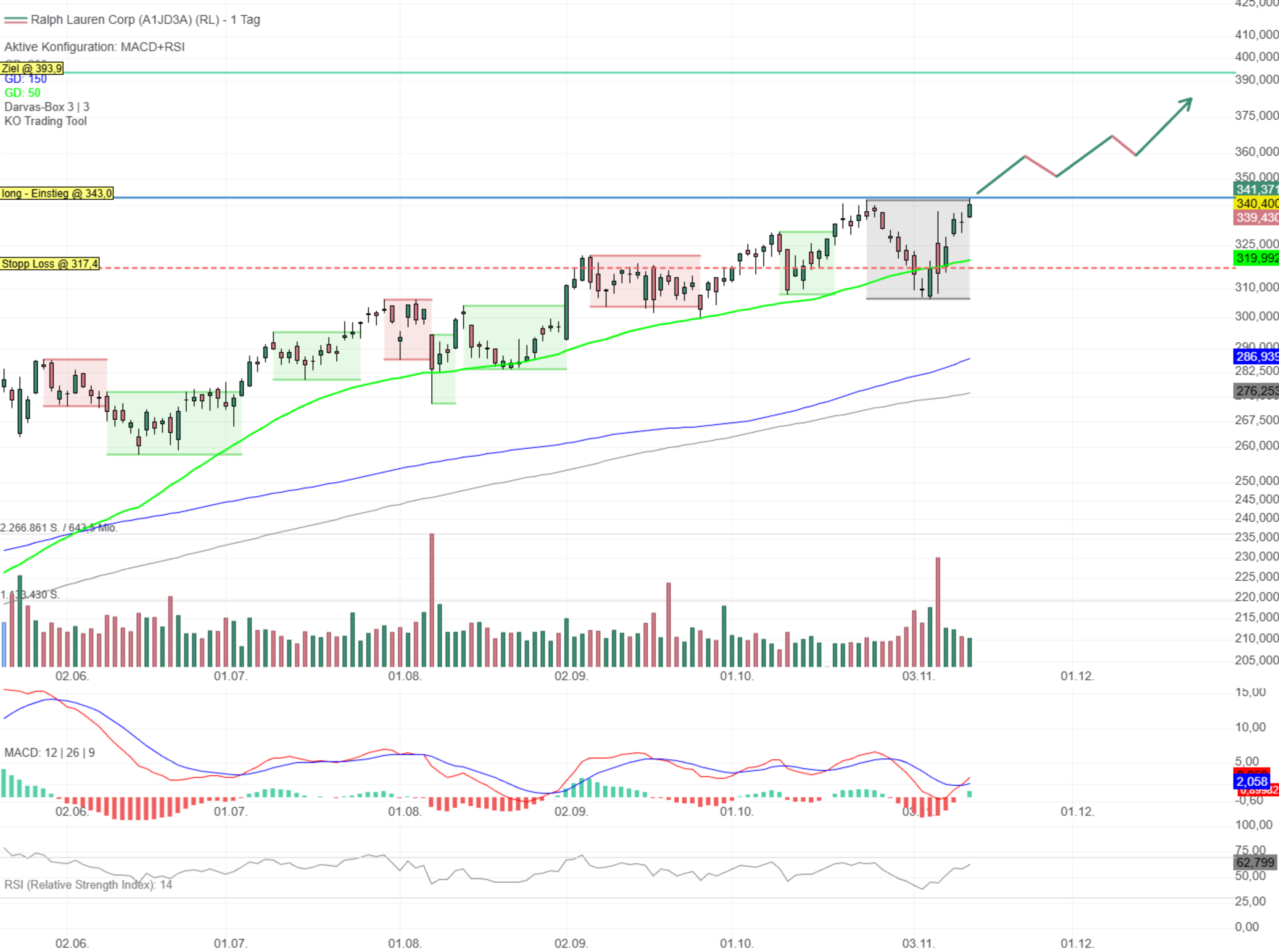 die Aktie von Ralph Lauren (WKN: A1JD3A) signalisiert ein bullisches Setup mit einem Breakout über das Allzeithoch bei etwa 343USD, was auf eine Fortsetzung des Aufwärtstrends hindeutet. Der Kurs hat sich seit April vom Tief um 178 USD beinahe verdoppelt und bewegt sich in einem aufsteigenden Trendkanal, gestützt durch den GD50 bei ca. 310 USD und die 200-Tage-Linie bei 276 USD, die als solide Supports dienen. Der MACD-Indikator liefert ein Kaufsignal, was zunehmendes Käufer-Momentum signalisiert. Der RSI notiert bei etwa 62, was auf Stärke hinweist, ohne überkaufte Zonen zu erreichen, und somit Raum für weitere Aufwärtsdynamik lässt. Der primäre Zielbereich liegt bei 390 bis 400 USD. Ein möglicher Pullback zur Breakout-Linie bei 340 USD könnte als Retest dienen und Einstiegschancen bieten. Das CRV bei Einstieg um 343 USD mit Stop-Loss unter 317 USD und Ziel bei 394 USD beträgt etwa 2:1.