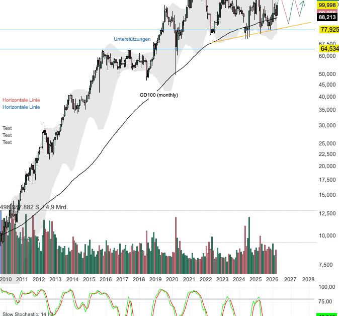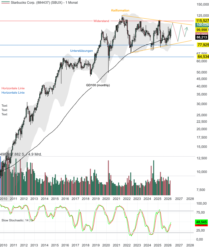 Aus charttechnischer Sicht befindet sich Starbucks in einem massiven übergeordneten Aufwärtstrend. Nach Erreichen des Allzeithochs bei ca. 125 USD ging die Aktie allerdings in eine Seitwärtskonsolidierung im Rahmen einer Keilformation über. Im Zuge dieser Konsolidierung verarbeitet die Aktie den vorangegangenen Kursanstieg. Solange sich Starbucks in diesem Keil aufhält, ist mit einer anhaltenden, sich stets verengenden Seitwärtsbewegung zu rechnen. Eine Keilformation kann sowohl eine übergeordnete Trendfortsetzung als auch eine Trendumkehr einleiten. Daher sind zwei Kursmarken für den weiteren Verlauf entscheidend: Steigt die Aktie über das letzte lokale Hoch bei 115 USD, stehen die Chancen für eine übergeordnete Aufwärts-Trendfortsetzung gut. Fällt Starbucks hingegen unter 78 USD, könnte eine größere Korrektur eingeleitet werden.