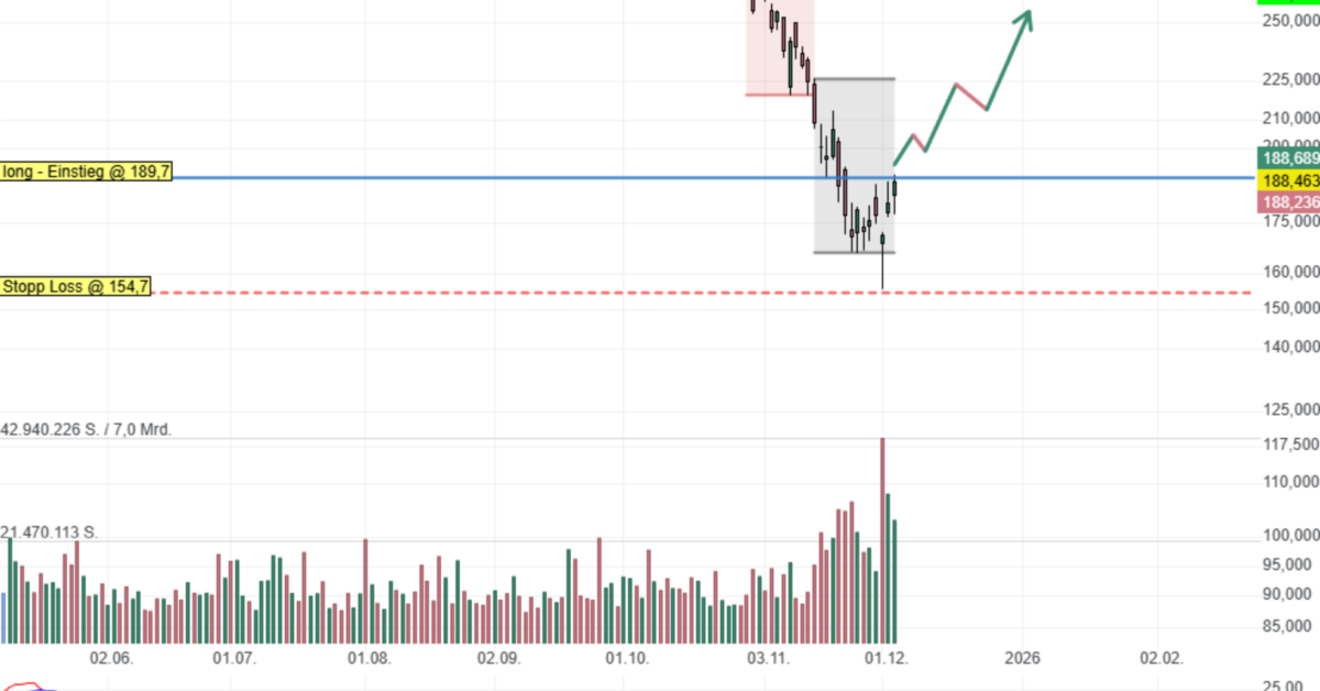 die Aktie von Strategy (WKN: 722713;i) bietet nach einem starken Abverkauf eine Reboundchance. Ja, die Aktie steckt im Abwärtstrend und ein Trade wird bewusst gegen die fallenden gleitenden Durchschnitte eingegangen. Für einen Long sprechen die Kaufsignale im MACD und im RSI, der sich wieder in den neutralen Bereich zurückgekämpft hat. Ein Stop bietet sich unter dem Hammer vom 1. Dezember bei 155 USD an. Der Hammer war nach einem Intraday-Comeback von zwischenzeitlich über -10% unter erhöhtem Volumen entstanden. Ein bullisches Zeichen. Als Ziel kann der GD50 bei rund 260 USD dienen. Das CRV beträgt ca. 2:1. Bleibt die Aktie danach bullisch könnten gar Ziele im Bereich von 330 bis 340 USD angepeilt werden, was das CRV nochmals deutlich verbessert. Trader stellen sich allerdings auf eine stärke Volatilität ein, da es dem Markt offensichtlich schwerfällt, ein faires Preisniveau für die Aktie zu finden.