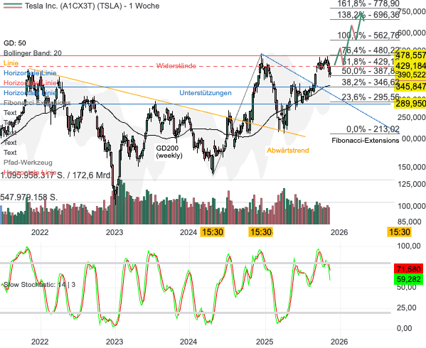 Aus charttechnischer Sicht befinden sich die Aktien von Tesla vor einer wichtigen Entscheidung: kann die starke vorangegangene Aufwärtsbewegung weiter fortgesetzt werden oder entsteht derzeit ein neues lokales Hoch. Gelingt Tesla der Anstieg über den Widerstand bei 430 USD, ergibt sich ein weiteres Aufwärtspotenzial bis zunächst 480 USD, gefolgt von 560 USD. Im Anschluss befinden sich die finalen Kursziele bei knapp 700 und 780 USD. In dieser Zone plane ich meine Positionen nahezu vollständig zu schließen. Solange die Aktie allerdings nicht über 430 USD ansteigen kann, bleibt das kurz- bis mittelfristige Bild angeschlagen. Das Ansteuern der Unterstützungszone von 350 USD wirkt derzeit als wahrscheinlich. Bestätigt wird dieser Abgabedruck vom Verkaufssignal in der Slow Stochastik. Der Oszillator baut seine überkaufte Situation derzeit ab.
