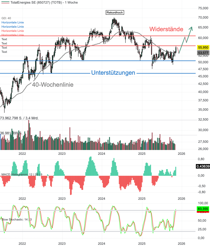 Die Aktie von TotalEnergies (TOTB) befand sich nach Erreichen des Rekordhochs bei 70 Euro in einer Korrekturphase. Seit Mitte des heurigen Jahres befindet sich das Papier des Ölunternehmens in einer Seitwärtsbewegung. Die jüngste Bewegung führte den Kurs an den Widerstand bei 56 Euro heran. Ein Ausbruch über diese Zonen wäre ein starkes Kaufsignal und könnte den Weg in Richtung des Rekordhochs ebnen. Die Überwindung der 40-Wochenlinie ist ein positives Zeichen. Nach diesem dynamischen Support liegt eine wichtige Unterstützung im Bereich von 50 Euro. Der Slow Stochastic-Indikator Indikator befindet sich im überkauften Bereich. Dies signalisiert, dass die jüngste Aufwärtsbewegung sehr stark war. Es besteht die Möglichkeit einer kurzfristigen Konsolidierung oder eines Rücksetzers, da in der Überbewertung oft Gewinnmitnahmen erfolgen.