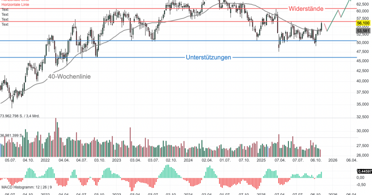 Bevorzugtes Szenario: Long-Einstieg bei 55 Euro, SL unter 50 Euro.