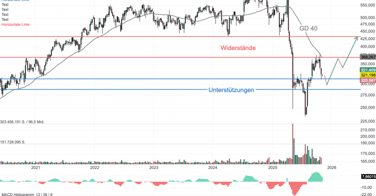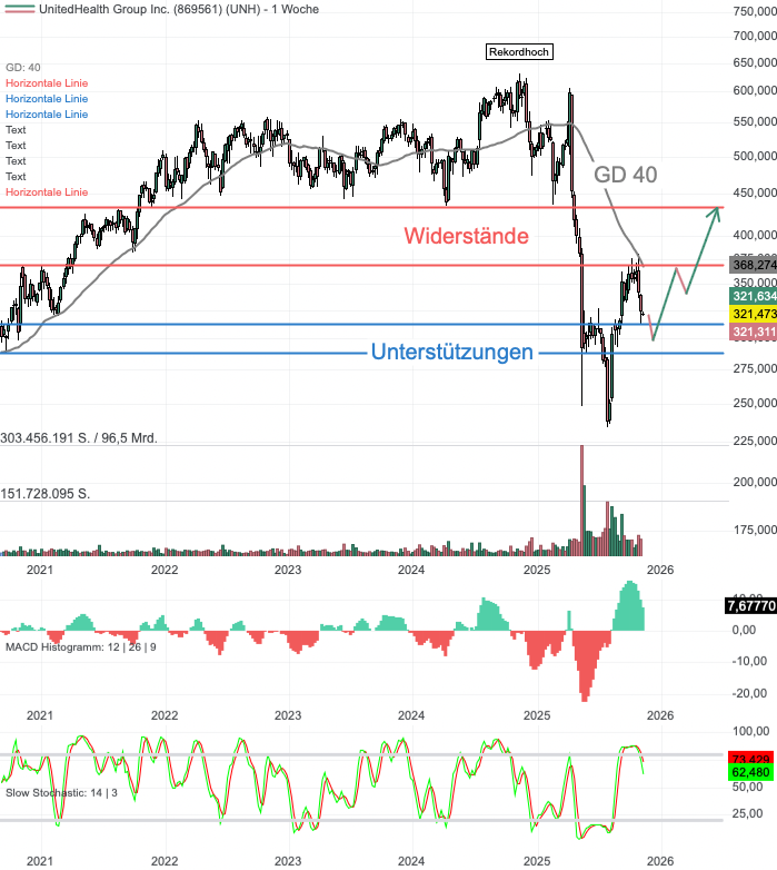 Die Aktie der UnitedHealth Group (UNH) befand sich über Jahre hinweg in einem starken Aufwärtstrend und erreichte ein Rekordhoch bei 630 USD. Von diesem Höchststand aus sahen wir einen drastischen Kurssturz in der ersten Hälfte des Jahres 2025. Der gleitende 40-Wochendurchschnitt fungierte lange Zeit als Unterstützung, wurde jedoch beim Einbruch klar und dynamisch unterschritten. Aktuell wirkt der GD 40 als aktiver Widerstand. Die Aktie hat nach dem starken Rücksetzer eine Bodenbildung vollzogen und ist im Begriff, sich von den Tiefstständen zu erholen. Wichtige Unterstützungen liegen bei rund 315 und 289 USD. Diese Zone darf nicht nachhaltig unterschritten werden. Der Slow Stochastic-Indikator hat im überkauften Bereich nach unten gedreht, was einen Rücksetzer begünstigen würde, bevor die Widerstände bei 367 und 436 USD angegangen werden können.