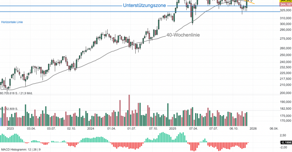 Die Aktie von Visa (V) befindet sich in einem langfristigen Aufwärtstrend, der durch die steigende 40-Wochenlinie bestätigt wird. Nach Erreichen eines Rekordhochs bei 375,51 USD hat die Aktie eine Korrektur eingeleitet und eine Abwärtstrendlinie ausgebildet. Der Bereich zwischen 321 und 335 USD fungiert als Unterstützungszone und hat den jüngsten Rückgang abgefedert. Diese Zone wurde in der Vergangenheit bereits mehrfach getestet. Aktuell wurde die Abwärtstrendlinie nach oben durchbrochen, was ein bullisches Zeichen ist. Ein nachhaltiger Ausbruch über den Widerstand bei 359 USD und insbesondere über das Rekordhoch bei 375 USD würde das nächste größere Ziel im Bereich der psychologisch wichtigen 400-USD-Marke eröffnen. Der Slow-Stochastik-Indikator hat im unteren Bereich nach oben gedreht und dadurch ein Kaufsignal generiert, was die kurzfristige Erholung unterstützt.