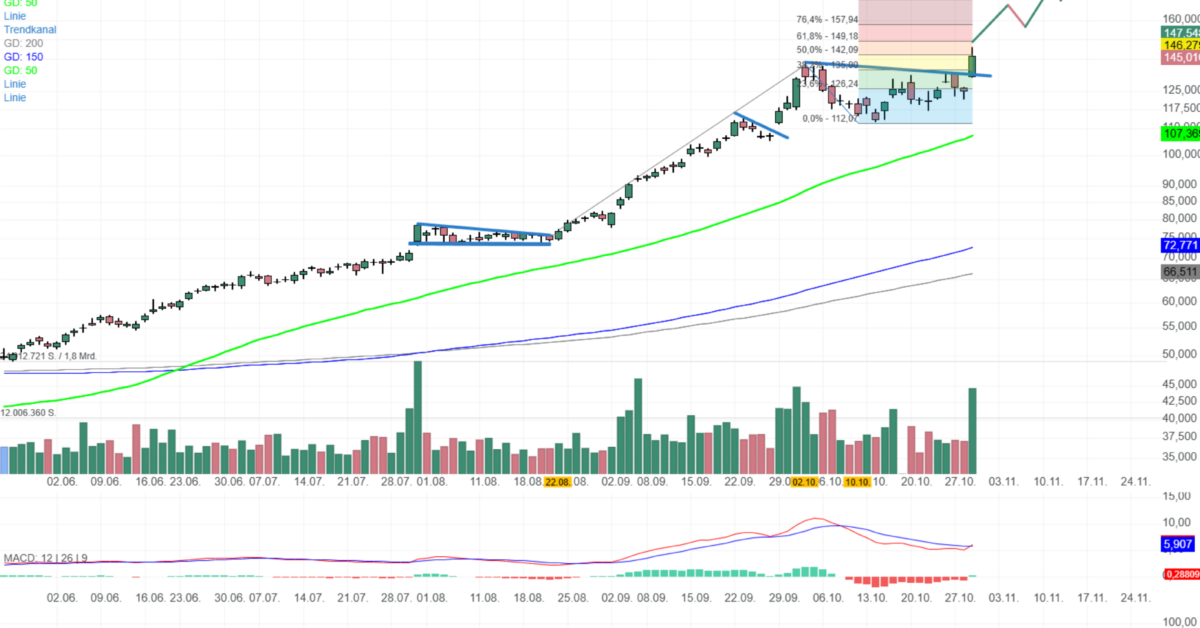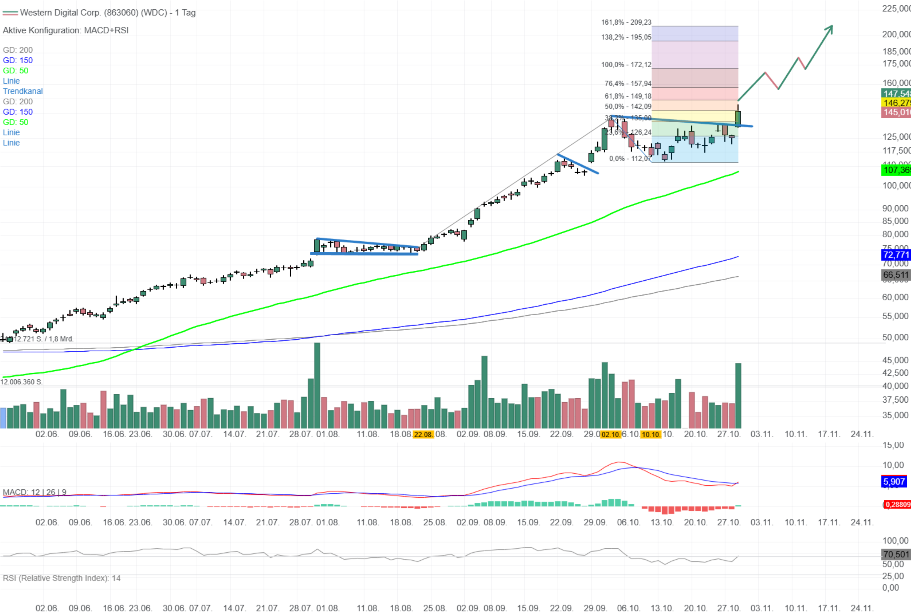 die Aktie von Western Digital (WKN: 863060) generiert mit dem Ausbruch ein neues Kaufsignal, unterstützt durch ein markantes Volumen-Cluster und Kaufsignale im MACD sowie einen bullischen RSI über 70. Nach einem Monat der Konsolidierung im Bereich 112 bis 135 USD ist der Bruch des Trendkanals erfolgt. Die gleitenden Durchschnitte (GD50/GD200) steigen und stabilisieren das Setup nach unten. Charttechnisch wurden mit dem Überschreiten der 146,50 USD neue Impulse in Richtung 172,00 USD (100%-Fibonacci) und 195–209 USD (Fibonacci-Extensions) aktiviert. Der Volumenausbruch am 03.11. signalisiert nachhaltiges Kaufinteresse von institutionellen Anlegern, was durch positive Quartalszahlen (Umsatz +31%, EPS deutlich über Erwartung) fundamental bestätigt wird. Das CRV erscheint attraktiv, da das Risiko klar mit SL unterhalb der Base bei ca. 112 USD abgesichert ist. Werden die übergeordneten Fibonacci-Marken abgearbeitet bis über die 200 USD- Marke, ergibt sich ein CRV von rund 1,8 : 1.