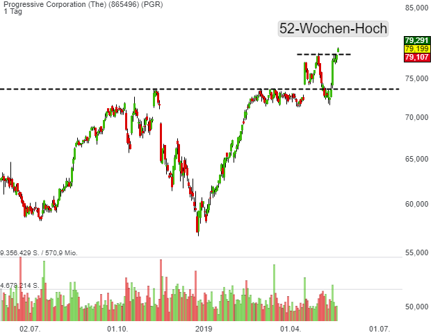 Sehr positiv entwickelt sich in dieser Berichtssaison auch die charttechnische Situation rund um die Aktie des mit 45,39 Mrd. USD kapitalisierten Konzerns Progressive Corp. (PGR) - Platz 80 der aktuellen TF-High-Quality-Stocks-Liste. Das Unternehmen ist eine Versicherungsgesellschaft und der führenden Anbieter von Kfz-Versicherungen in den USA. Die Holding-Gesellschaft verfügt heute über ein weitverbreitetes Netz aus über 500 Zweigniederlassungen mit mehr als 35.000 unabhängigen Versicherungsmaklern in allen US-Bundesstaaten und Kanada. Das Portfolio des Unternehmens bedient hauptsächlich Privatkunden sowie kleinere Gewerbekunden. Es werden alle Arten von privaten und gewerblichen Fahrzeugen versichert. Darüber hinaus bietet das Unternehmen einige weitere versicherungstechnische Serviceleistungen an, wobei die Vermittlung hauptsächlich via Internet und Telefone stattfindet. Zuletzt zeichnete sich auch eine Expansion in Richtung von Immobilien-Versicherungen, wo das Wachstum via Übernahmen forciert wird.