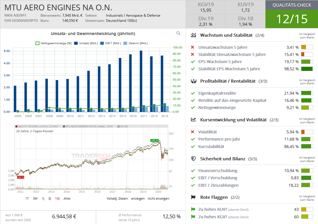 Wie stark die Stellung des führenden Triebwerksherstellers Deutschlands ist, zeigt sich anhand der Sechsmonatszahlen. Während die Luftfahrt wegen Corona zwischenzeitlich fast zum Stillstand kam, erwirtschaftete MTU eine operative Ergebnismarge von 10,9 %. Der Umsatz sank vergleichsweise moderat zwischen Januar und Juni von 2,2 auf 2,0 Mrd. Euro.