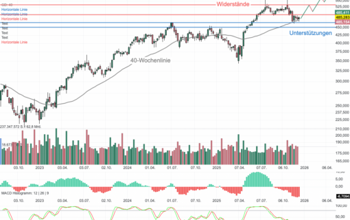 Gesunde Korrektur oder tiefere Konsolidierung? Nach dem Rekordhoch bei 555 USD hat Microsoft deutlich Luft abgelassen. Die überverkaufte Stochastik macht Hoffnung auf eine baldige Erholung.
