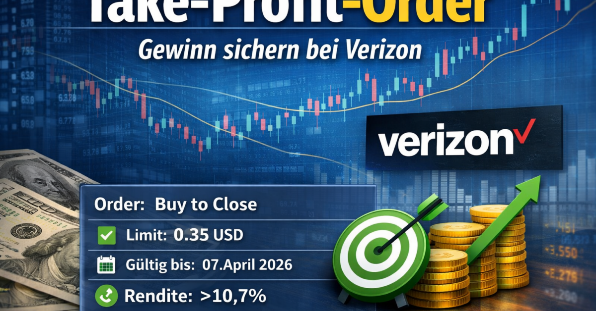 Liebe Dividenden-Investoren, unser vor zwei Wochen eröffneter Short Put auf Verizon (Laufzeit bis zum 17.04.) entwickelt sich hervorragend. Um Emotionen aus dem Handel zu nehmen und unsere bisherigen Buchgewinne abzusichern, platzieren wir heute eine automatische Take-Profit-Order. Unser Ziel: Bei...