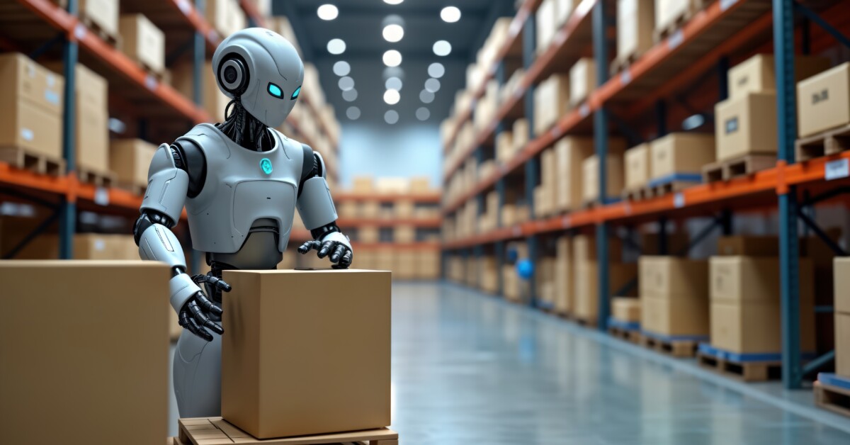 'post_title' => 'Robotic warehouse worker sorts, packs items. Automation in logistics. Warehouse tech solutions. Modern tech for efficiency. Future of work. Robot handling packages. Automated inventory management.',