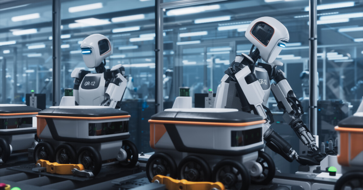 'post_title' => 'Humanoid Robots Operate on a High-Tech Assembly Line in a Factory, Constructing Compact Autonomous Delivery Units. AI-driven Factory with Next Generation Robotics and Manufacturing',