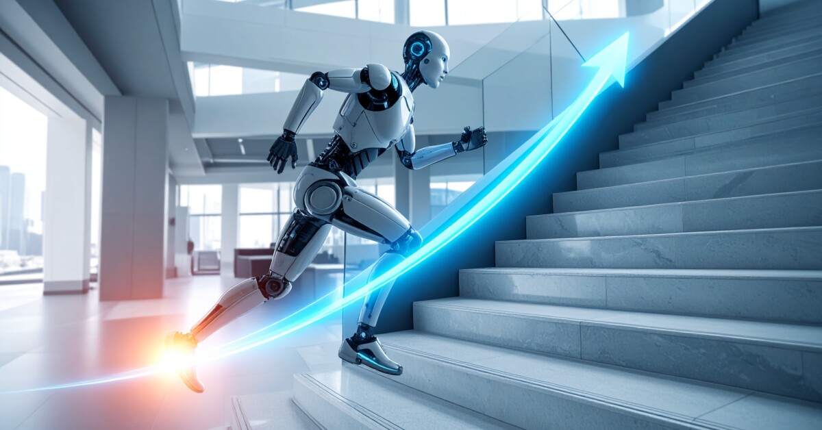 'post_title' => 'A futuristic robot runs up a flight of stairs with a glowing arrow, symbolizing growth and progress. The robot\'s sleek design contrasts with the architectural details of the building.',