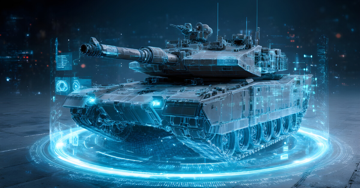 'post_title' => 'A high-tech armored tank with a glowing digital interface and futuristic holographic display represents modern military innovation. Concept of advanced defense systems',