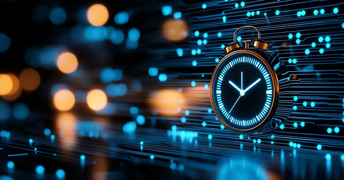 'post_title' => 'A close-up of a stopwatch against a vibrant, digital background featuring bright blue lights. This image symbolizes precision, timing, and the intersection of technology and time.',