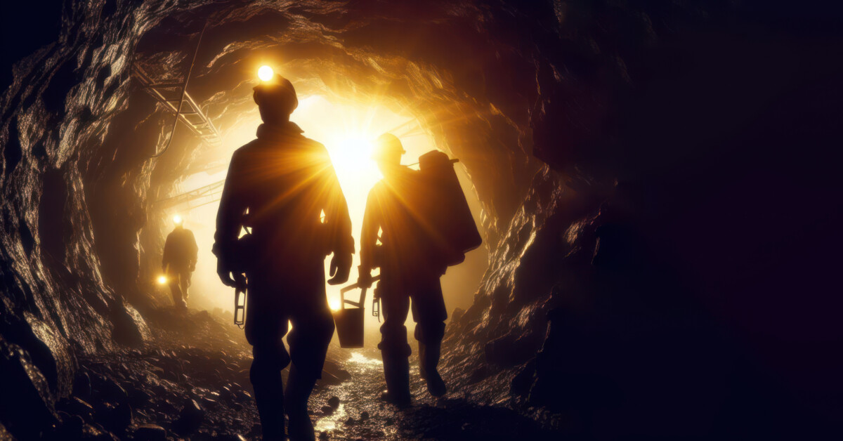 'post_title' => 'Silhouette of Miners with headlamps entering underground gold mine',