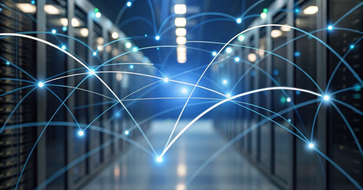 'post_title' => 'A futuristic data center featuring interconnected servers with glowing network lines, symbolizing data flow and connectivity in technology.',