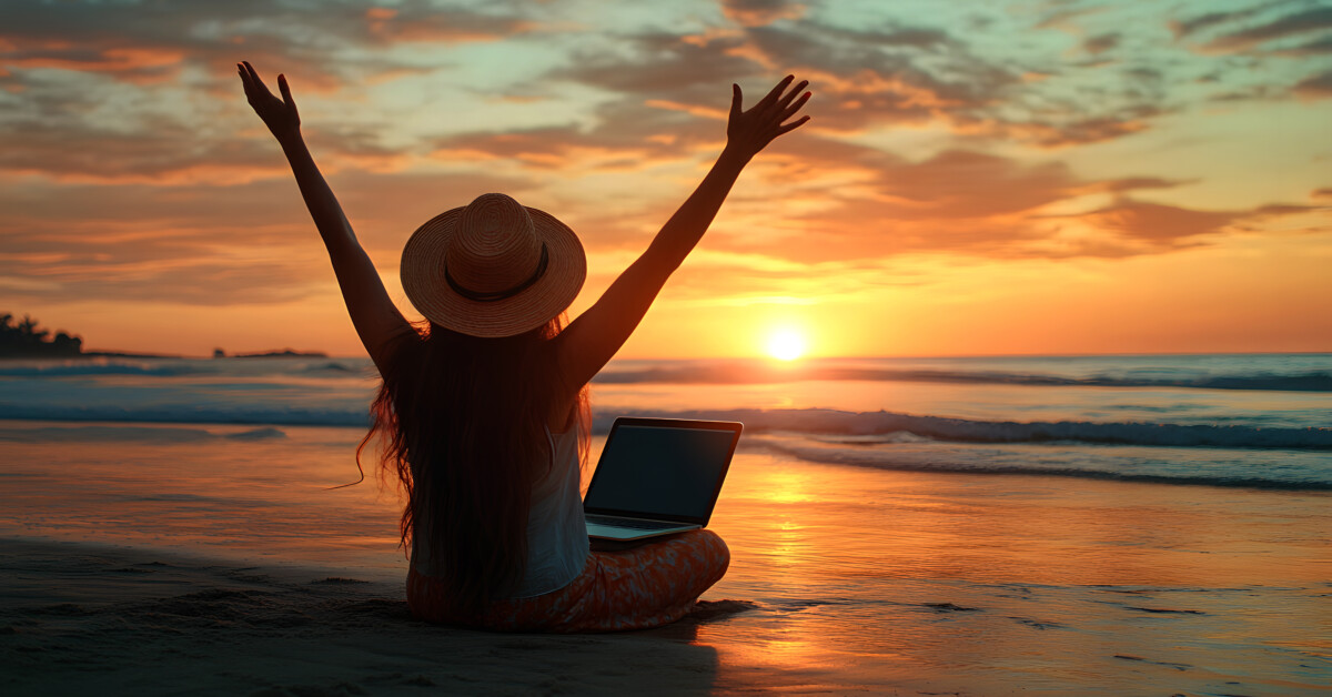'post_title' => 'female freelancer in straw hat working on laptop, cellebrating success while sitting on the tropical sandy beach at sunset, Generative ai',