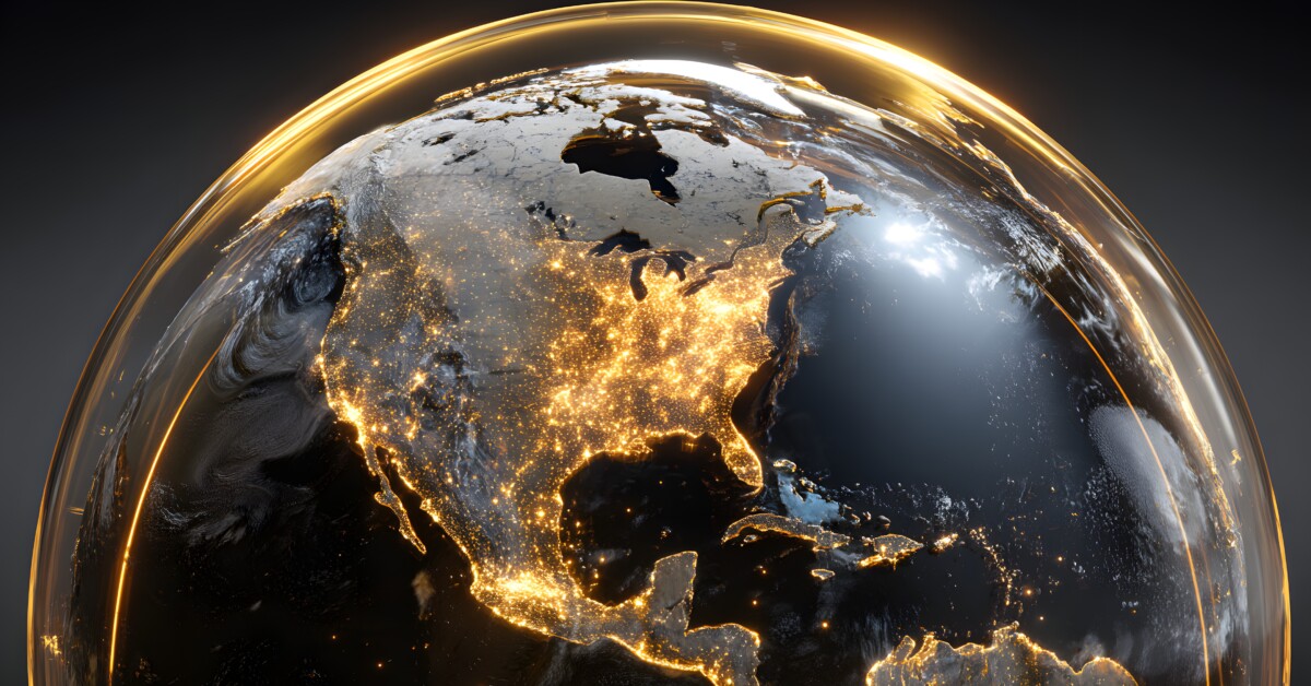 'post_title' => 'Abstract view of earth with glowing north America encased in a Golden Dome, evoking themes of security and technological advancement',