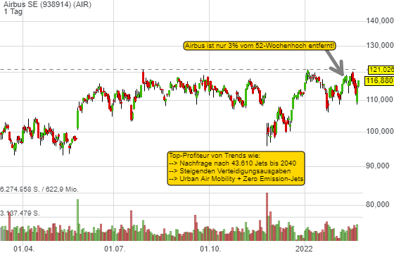 Die Aktie von Airbus gehört mit einem Abstand von nur 3% zu den führenden Aktien am deutschen Markt. Es gibt drei Gründe, warum sie über die nächsten Wochen abheben und den 120 Euro-Widerstand herausnehmen müsste!