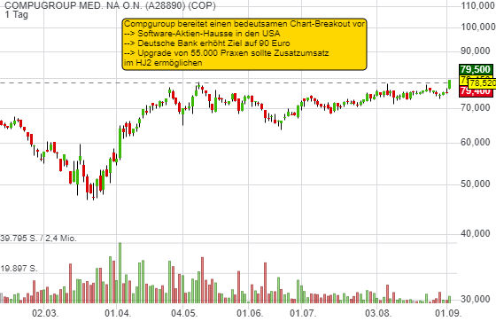 1.) In den USA ist eine brutale Hausse bei den Software-Aktien am Laufen. Oft schwappen solche Trends auch auf den deutschen Markt über. Compugroup ist einer der führenden IT-Konzerne für Lösungen im Gesundheitswesen. Zudem bricht die Aktie auf das 52-Wochenhoch aus. Das macht sie zu einem Favorit.