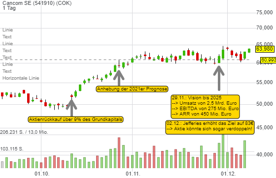 1.) Die Pivotal Price Line um 61 Euro hat perfekt gehalten. Sie resultiert aus der bis 2025 erwarteten Wachstumsbeschleunigung auf 2,5 Mrd. Euro an Umsatz und 275 Mio. Euro an EBITDA mittels Übernahmen und Ausbau des Cloud-Geschäfts.