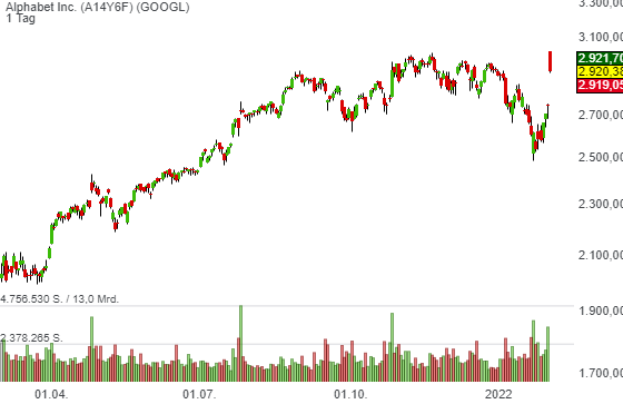 Der Maß aller Tech-Dinge ist wohl der IT-Gigant Alphabet (GOOGL). Der Mischkonzern hat für das vergangene 4. Quartal ein phänomenal starkes Ergebnis verbucht. Der Q4-Umsatz stieg dabei im Vergleich zum Vorjahreswert um 32 % auf 75,33 Mrd. USD (Konsens: 72,13 Mrd. USD). Das EPS von 30,69 USD fiel ebenfalls deutlich besser als die erwarteten 27,32 USD aus.