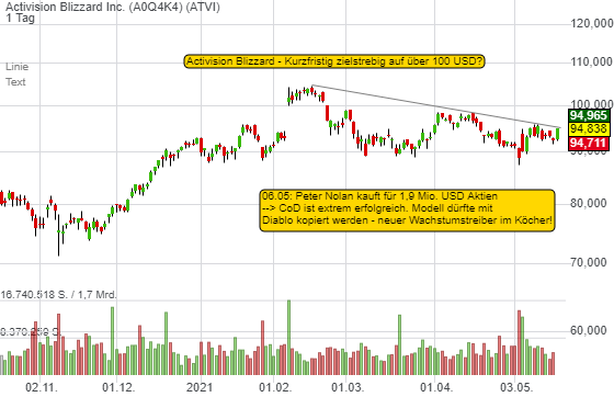 Für Trader ergibt sich bei Activision Blizzard eine kurzfristige Chance, denn mit dem Ausbruch über die seit Februar gebildete Widerstandslinie hat die Aktie wieder Raum für Kurse um 100 USD. Was spricht dafür?