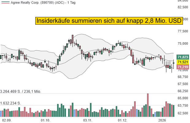 Wachstum entsteht nicht nur durch Akquisen, sondern zunehmend durch die "Developer Funding Platform" (DFP). ADC finanziert Bauprojekte für Entwickler und sichert sich so frühzeitig attraktive Standorte, noch bevor diese auf den offenen Markt kommen. Damit wird der Konzern zum integralen Teil der Expansionsstrategie seiner Mieter. Ergänzend treiben vertragliche Mietsteigerungen und aktives Kapitalrecycling das interne Wachstum voran. Dieser Mix aus Akquisition, Entwicklung und Partner-Finanzierung soll auch 2026 den AFFO je Aktie steigern und die monatliche Dividende sichern. Im Zeitraum zwischen dem 24. Dezember 2025 und 09. Januar 2026 haben Direktor John. Rakolta Jr. und Vorstandsvorsitzender Richard Agree Aktien zu Stückpreisen zwischen 70,67 USD und 72,18 USD für insgesamt 2.778.780 USD gekauft.