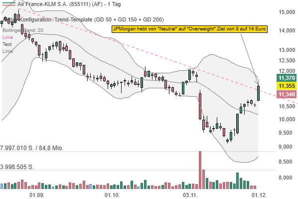 Das Kundenerlebnis wird durch Kabinenausstattung, digitale Services (wie verbesserte Gepäcksuche bei KLM) und das erfolgreiche Loyalitätsprogramm Flying Blue kontinuierlich verbessert. Hierauf haben auch die Analysten reagiert. JPMorgan hat die Einschätzung für Air France-KLM am 30. November von "Neutral" auf "Overweight" hochgestuft und das Kursziel von 8 auf 14 Euro angehoben. Die Favoriten der Experten Alexia Dogani und Harry Gowers im europäischen Transportbereich bleiben derweil DSV und die Airline-Holding IAG. Bei der Lufthansa und Air France-KLM rechnen sie mit besseren Bedingungen im Langstreckenbereich und sehen Margenpotenzial. Charttechnisch kann die Aktie durch den Impuls über eine Widerstandslinie ausbrechen.