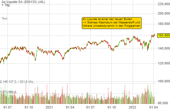 Die Aktie von Air Liquide sticht unter den Titel mit einem Bezug zu grünen Technologien heraus. Denn der Industriegaskonzern ist auch auf den Aufbau der Wasserstoffinfrastruktur spezialisiert. Die EU will über das FF55-Programm sowie den RePowerEU-Plan bis 2030 den Import und die Produktion von Wasserstoff auf über 20 Mio. Tonnen steigern. Dazu muss über Jahre hinweg eine Infrastruktur geschaffen werden. Für Air Liquide wird das einer der Wachstumstreiber werden!