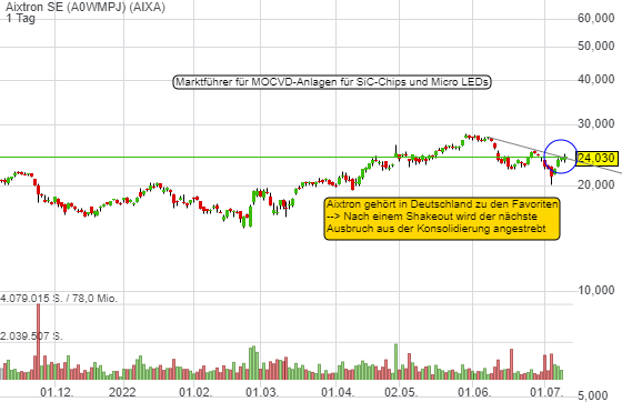 An den News von STMicro und Globalfoundries sieht man heute, dass die Kapazitäten für die Chipfertigung weiterhin kräftig ausgebaut werden. Die Staaten subventionieren das. Aixtron liefert die MOCVD-Anlagen, das wichtigste Verfahren für die Fertigung von Verbindungshalbleitern. Aixtron hat jetzt den Vorteil schon auf 75% an Marktanteilen zu kommen. SiC-Chips und Micro LEDs sind die strukturellen Wachstumstreiber der nächsten Jahre, weshalb sich der Konzern auch besser gegen eine Abschwächung bei der allgemeinen Chipnachfrage stemmen sollte. Denn Aixtron verdrängt seine Wettbewerber und adressiert Endmärkte, die erst am Anfang stehen. Wenn die optimistischen Managementaussagen stimmen, sollten sich die Ordereingänge robust entwickeln und keine Bremseffekte zu verzeichnen sein.