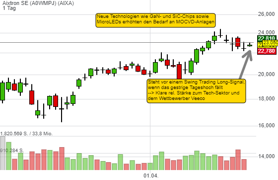 Die Aktie von Aixtron ist für einen Swing Trade eine Option, sobald sie über das gestrige Tageshoch um 23,05 Euro steigt. Die Risikotoleranz würde sich bis knapp unter 22 Euro anbieten. Es gibt drei Gründe, warum die Aktie kurzfristig interessant ist: