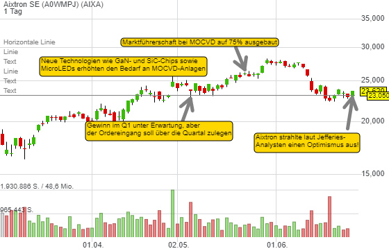 Die Pivotal Price Line resultiert von den Q1-Ergebnissen. Aixtron hatte anziehende Ordereingänge im Jahresverlauf in Aussicht gestellt. Bei MOCVD-Anlagen baute der Konzern die Marktführerschaft auf. Der Marktanteil beträgt nun 75%. MOCVD stellt das wichtigste Verfahren für die Herstellung von Verbindungshalbleitern auf GaN-Basis dar, die wiederum die Basis für LEDs sind. Analysten halten bei Aixtron bei MOCVD-Anlagen sogar eine vergleichbare Stellung, wie sie ASML bei der EUV-Technologie hat, für möglich. Positiv überraschen könnte die Nachfrage nach MOCVD-Anlagen wegen der zunehmenden Penetration von GaN-, SiC-Chips und Micro LEDs. Die marktführende Stellung hat seinen Preis. Per 2024 beträgt das KGV 18 und das KUV kommt auf 4.