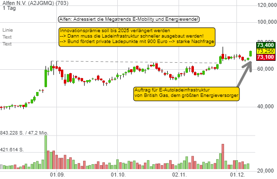 2.) Heute bildete sich ein neuer Pivotal News Point. Alfen schloss einen 3-jährigen Rahmenvertrag mit dem größten Energieversorger aus UK, British Gas, über die Lieferung von E-Autoladelösungen. Finanzielle Details gibt es nicht, aber es dürfte sich um eine größere Order handeln und stellt einen bedeutsamen Referenzkunden dar. Dieser kann die Tür für weitere Aufträge in UK und anderen Märkten öffnen. Im Q3 wuchs das Segment für Ladelösungen um 72% auf 11,3 Mio. Euro.