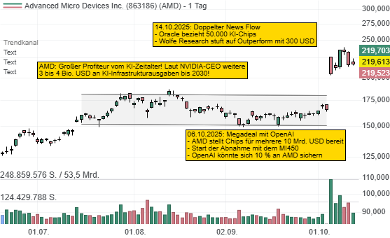 Die jüngsten Erfolge spiegeln sich in den optimistischen Analystenstimmen wider. Wolfe Research hat das Rating für AMD von Peer Perform auf Outperform hochgestuft und ein Kursziel von 300 USD ausgegeben. Die Analysten sehen aufgrund des OpenAI-Deals ein EPS-Potenzial von über 10 USD pro Aktie. Sollte das Unternehmen über OpenAI hinaus an Zugkraft gewinnen und das traditionelle Servergeschäft weiterhin Stärke zeigen, bestehe kurzfristig weiteres Potenzial für steigende Gewinnschätzungen.
