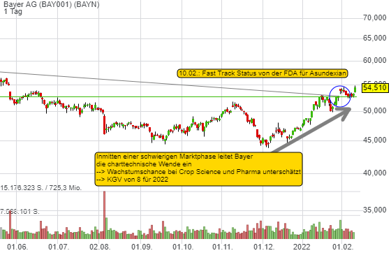 Die Aktie von Bayer ist in diesem Jahr sehr markant und koppelte sich von den rückläufigen Indizes ab. Jetzt leitet sie die charttechnische Wende im Big Picture ein. Was macht sie spannend?
