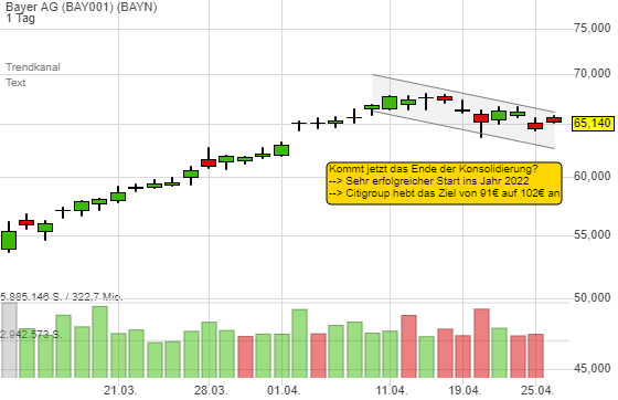 Bei Bayer, die nur mit einem 8,5er KGV23e bewertet ist, sollte die Aufwärtsbewegung zeitnah weitergehen. Wir sind auch im TraderFox-Musterdepot dabei und 21% im Buchgewinn. In der Pharma-Sparte hat Bayer mit Asundexian einen Xarelto-Nachfolger in der Pipeline, welcher sogar für höhere Umsätze sorgen kann, da das Wirkungsprofil besser ist und die Umsätze nicht geteilt werden müssen. In der Agrar-Sparte rückt das Glyphosat-Thema in den Hintergrund und die Nachfrage boomt aufgrund der gestiegenen Agrarpreise und Notwendigkeit die Produktivität zu steigern.