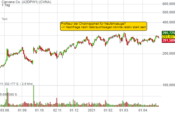 2.) Der Chipmangel in der Autofertigung hat schon zu Produktionskürzungen bei Volvo, Ford, Daimler, VW usw. geführt. Die Wartezeiten bei Neubestellungen sind lange. Wer kurzfristiger ein Fahrzeug möchte, könnte zu gut erhaltenen Gebrauchtwagen greifen und damit über Carvana ordern.